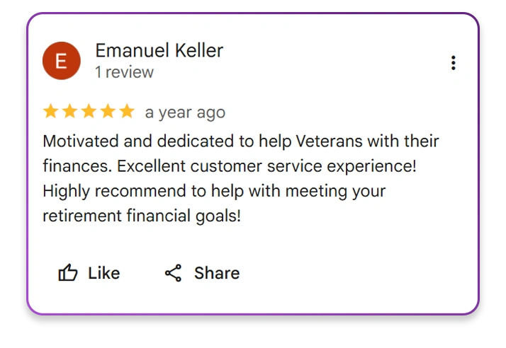 You’re getting guidance, strategy, and a trusted partner who understands your benefits, your background, and your desire for long-term security.